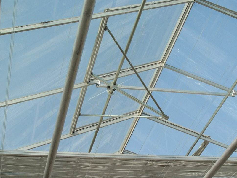 連續開窗系統,由若干排齒輪齒條,在驅動軸的帶動下,將溫室窗戶進行開啟。連續開窗適用于各種類型的溫室,可有效提高溫室通風面積,達到增加溫室通風降溫的效果。主要設備配件有減速電機、傳動軸、齒條、齒輪、軸承座等。扭距分配式開窗系統是連續式開窗的一種,由一臺減速電機驅動一系列扭距分配器,扭距分配器作用于連續開窗的驅動軸,實現開窗。交錯開窗系統又稱為推桿開窗系統,適用于Venlo型溫室。開窗時,齒輪齒條在驅動軸帶動下運動,推動推桿向前運動,在支撐臂的作用下,將窗戶打開。交錯式開窗僅適用于頂開窗系統。交錯式開窗因齒輪齒條機構不同而分為軌道式和擺臂式兩種形式。二者主要區別于,前者單根齒條推力大,可適用長度較大的溫室,后者適用于長度較小,但結構簡單,造價較低。系統組成:齒輪、齒條、推拉桿、減速電機、驅動軸、支撐臂等附件。