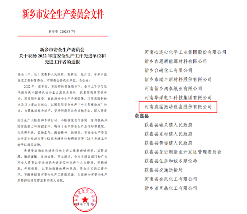 2023年7月,河南威猛振動設備股份有限公司被新鄉市安全生產委員會授予“2022年度市級安全生產工作先進單位”榮譽稱號。此項殊榮,是新鄉市安全生產委員會對公司安全工作的高度肯定。威猛股份自成立以來,始
