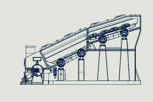 振動風選機直接進行物料篩分,將渣土等物料作為篩下物篩分出來,剩余篩上物進入振動風箱,風箱座于激振器上并接有風力系統(tǒng),物料由于重量的不同在風力的作用下輕、重物質(zhì)分別沿不同的運動軌跡落入前端料斗中,激振器提供振源并在風力系統(tǒng)的吹風功能影響下,更有效的使輕重物質(zhì)分離,受風力作用落入最前端吸風滾筒處由刮板刮出輕物質(zhì),而未吹起的物料則落入風箱前端出料口。