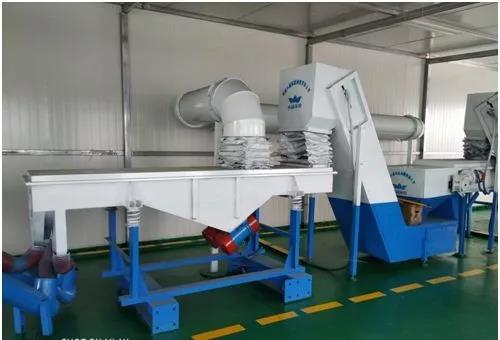 (6)金屬與非金屬材料分離技術(shù)。通過(guò)振動(dòng)篩分選出大小不同的物料,大物料利用金屬材料在變化磁場(chǎng)內(nèi)部產(chǎn)生旋渦狀的感應(yīng)電流,與磁輥產(chǎn)生互斥力,金屬物料越大互斥力也越大,通過(guò)調(diào)節(jié)電磁輥擋板,完成銅鋁與非金屬包裝的分離。小物料產(chǎn)生的互斥力太小,不好分選則根據(jù)各種物料之間比重、容重、摩擦系數(shù)等物理特性的不同,利用比重分選設(shè)備實(shí)現(xiàn)分選。