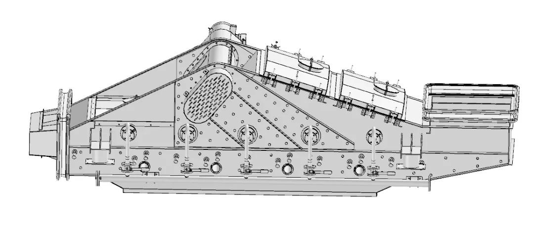 其中激振器為法蘭式激振器,安裝在篩體的篩幫上,可以減小設備高度,節約現場空間;篩體上安裝有密封蓋密封,進、出料口安裝有軟連接密封;可以實現全密封結構設計。
