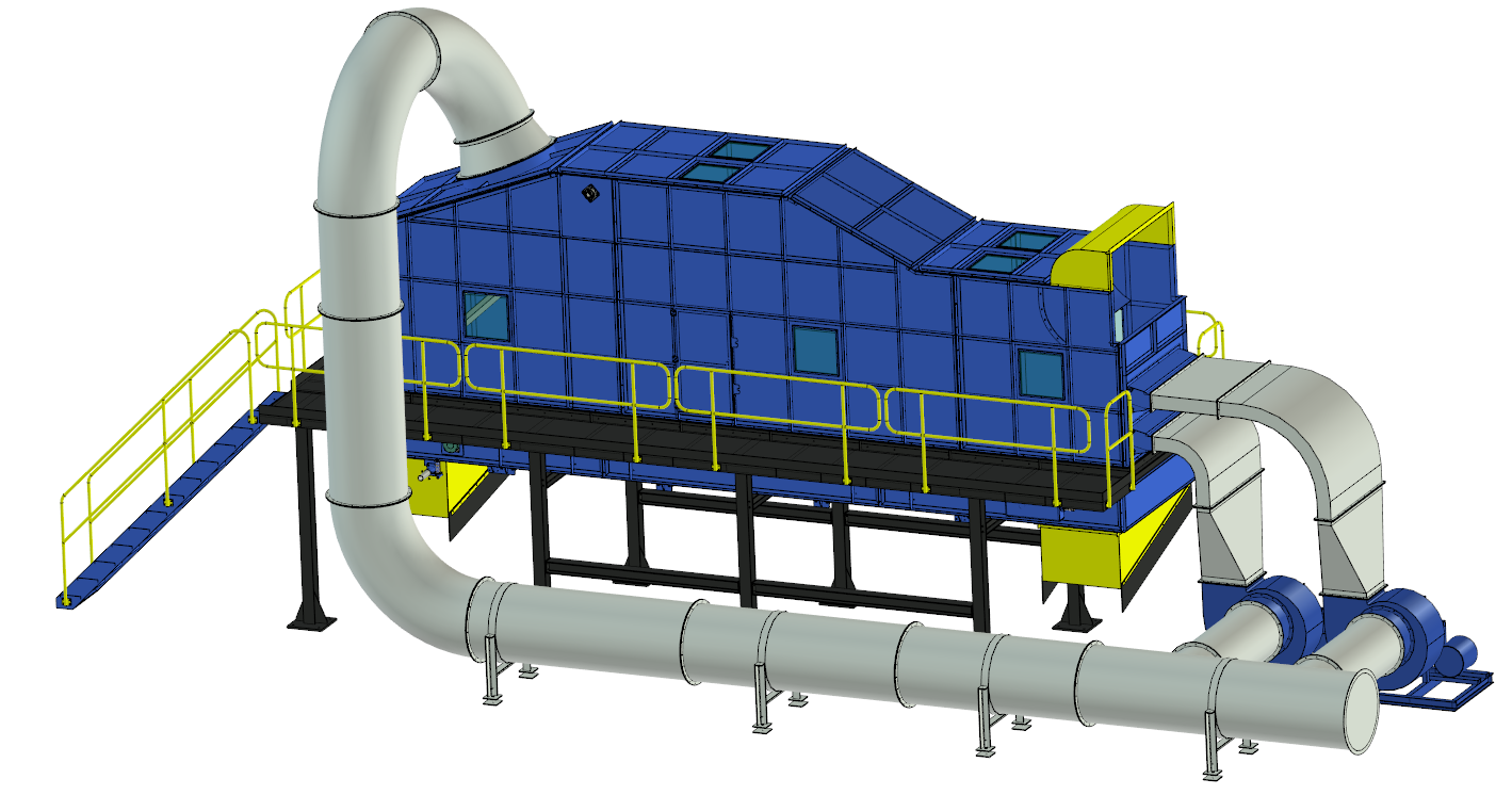 初代分風選機為自主研發設備,經反復試驗后投入使用;總結經驗與問題后,第二代風選機對初代風選機的落料口位置進行調整、送風系統及氣流通道進行優化,提高物料風選的純凈度;第三代風選機采用雙風機進風口,增設進風口調節閥,同時采用循環風設計,實現設備的綠色化,對輸送系統以及風機箱體的密封性提出了設計及制作要求,不僅能保證設備的功能,更是對產品的節能提出了要求;第四代風選機在第三代的基礎上研發增加進料導料裝置,輸送系統在保證密封性的前提下與風選機箱體分離,便于安裝,設備整體使用功能不僅更加完善,且具有更便捷的安裝方式,更美觀的造型。