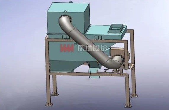 輕物質分離器包括機架、風管風選箱及離心風機等部分。風選箱固定在機架上,風選箱具有物料進口、重物質出口和輕物質出口。風選箱內設有下料坡面,下料坡面的上端位于風選箱的物料進口處,下端與重物質出口相連,下料坡面的背面連接有吹風裝置。該設備在運行時,物料從進口進入風選箱,在重力的作用下,物料沿下料坡面自動滑落,物料滑落到重物質出料口處時,吹風裝置將建筑垃圾中的輕物質吹到輕物質腔里收集后處理,重物質則通過重物質出料口排出風選箱。