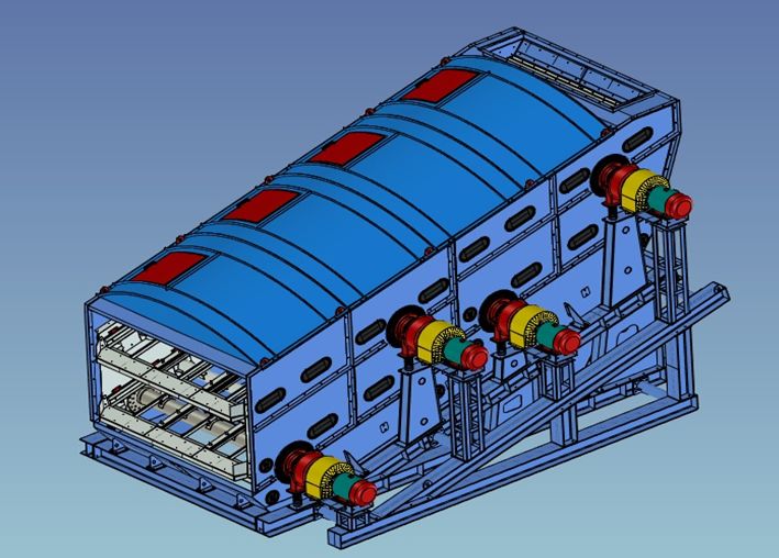 砂石骨料生產線一般由輸送、破碎、篩分等設備組成,其中的篩分設備主要包括復頻篩及傳統的圓振篩等。傳統圓振篩有單軸和雙軸兩種類型,利用一個帶偏心塊的激振器帶動整個篩箱實現振動,運動軌跡一般為圓形或近似圓形